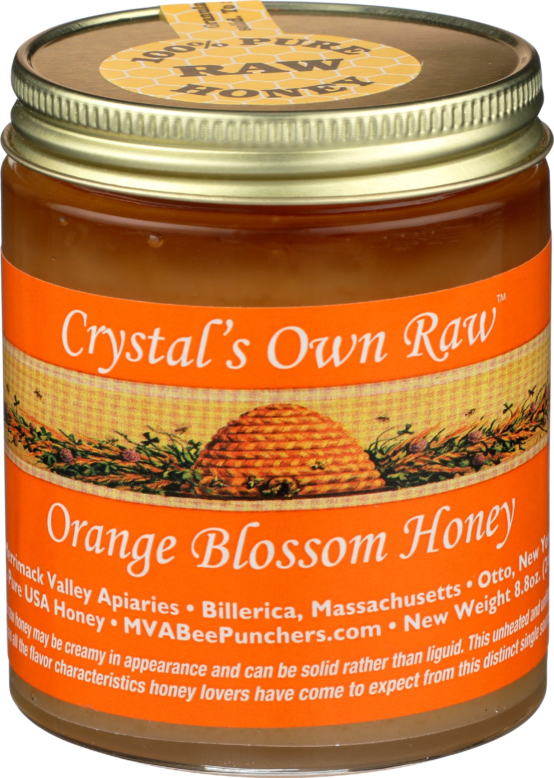 Raw Orange Blossom honey is delicate, nearly white in color and the blossom has a fragrance when standing in an orange grove at bloom. Orange blossom honey was sold at fruit stands when your grandparents bought bagged oranges to take North in the spring. Unlike the “olden” days, Crystals Own raw orange blossom honey is neither heated nor filtered, is most often granulated, and is extracted straight from the hive. It retains all of the flavor and aroma you would expect from this magnificent single source honey. All natural raw orange blossom honey also goes great with tea and many other foods like vanilla ice cream and pastries.