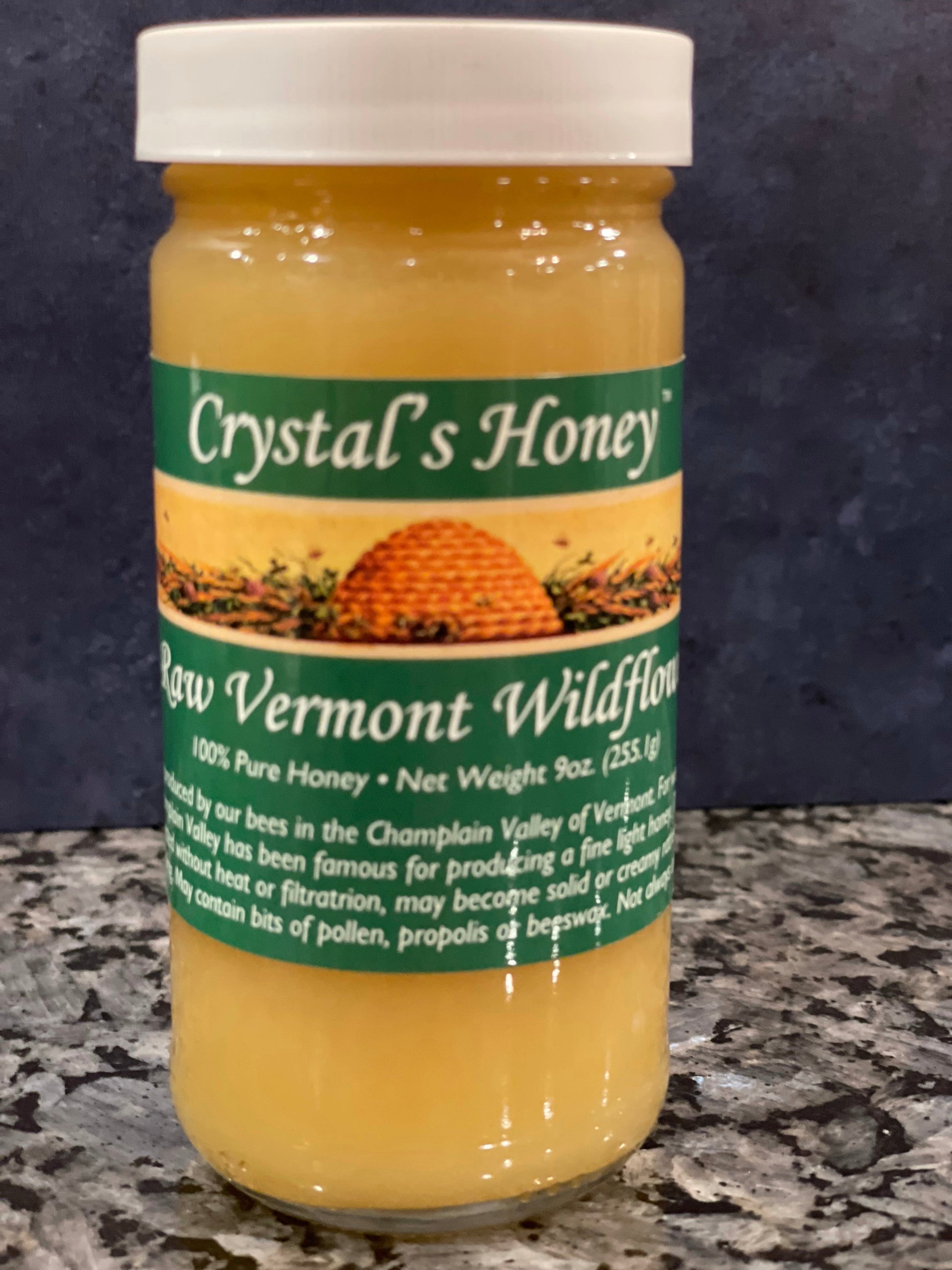 This honey is produced by our bees in the Champlain Valley of Vermont. For well over 100 years the Champlain valley has been famous for producing a fine light honey. This authentic raw honey is extracted without heat or filtration, May become solid or creamy rather than liquid after bottling. May contain bits of pollen propolis or beeswax.